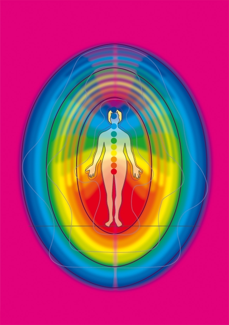 Il existe en plus de ces correspondances une enveloppe subtile, appelée « aura » dans cette tradition, qui contient plusieurs couches et qui est traversée par des vortex appelés « chakras » : à chaque niveau principal du corps correspond un chakra et une couleur. La fonction du chakra est de faire le lien entre le corps physique (la lumière condensée), et le corps subtil (la lumière fluide).Le bon fonctionnement de ces chakras est le reflet et la condition de notre bonne santé.