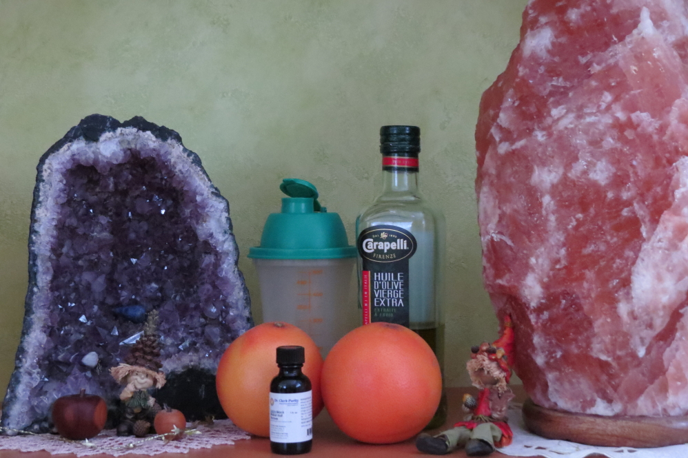 À 21H45, presser les pamplemousses pour en extraire le jus. Dans un pot, mélanger : huile d’olive + le jus fraîchement pressé + 30 gouttes de teinture mère de noix. Fermer le couvercle du pot et secouer vigoureusement pour bien tout mélanger.